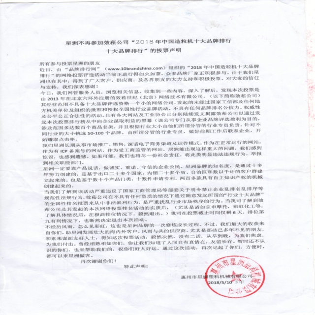 星洲不再参加效菘公司“2018年中国造粒机十大品牌排行