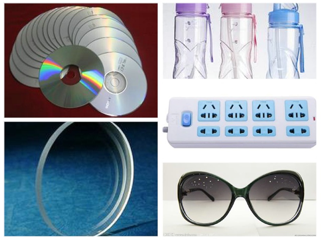 光盘、灯罩、电话、手机镜头、眼镜片、水瓶、奶瓶、太阳镜、纯净水桶、手机壳、水杯、果汁杯、雪糕杯、塑料椅、保险盒、电脑外壳、瓶底编号为7的瓶子、冰箱抽屉、车灯、仪表盘安全灯罩、信号灯、透明防护板、采光玻璃、高层建筑玻璃、汽车反射镜、挡风玻璃板、汽油泵表盘、汽车仪表板、货栈及露天商业标牌、家用电器马达、真空吸尘器,洗头器、咖啡机、烤面包机、动力工具的手柄,各种齿轮、蜗轮、轴套、导规、冰箱内搁架、飞机座舱玻璃。用作前灯罩,带加强筋汽车前后档板,反光镜框,门框套、操作杆护套、阻流板、PC被应用用作接线盒、插座、插头及套管、垫片、电视转换装置、电闸盒、电话总机、配电盘元件,继电器外壳、计算机架,外壳及辅机,打印机零件、头盔和安全帽,防护面罩,墨镜和运动护眼罩、照明系统、仪表板、加热板、除霜器及聚碳酸酯合金制的保险杠等