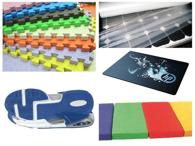鼠标垫、泡沫拼图、运动鞋底、坐垫、箱包、酒瓶垫盖、鞋垫、拖鞋、园丁鞋、太阳能光伏膜、隔音板、体操垫、包装膜、医用膜、电线护套、电缆护套、童车轮子、热熔胶、弹性薄膜、热熔粘合计涂层制品、功能性棚膜、家具封边、无线书籍装订边、铸造膜、层压膜